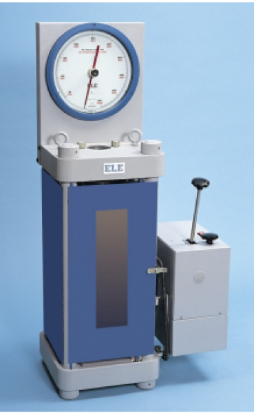 The load frame is of high quality steel construction with a fixed upper head carrying a ball-seated platen. The ram carrying the lower platen is contained in the base of the frame and is protected by a shroud.Sufficient clearance between the platens allows the compression testing of concrete cylinders up to 160 mm diameter by 320 mm long. To allow for the compression testing of concrete cubes, a range of distance pieces is available.