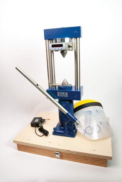 Originally developed at Imperial College, London, the apparatus comprises a two-column fixed crosshead frame and a hand operated hydraulic jack. Pressure applied by the jack extends the piston carrying the lower conical point. The upper point is fixed to the crosshead with a scale mounted on the frame to provide specimen diameter information for use in point-load strength index calculations. Pressure is indicated directly on the digital readout unit. Loads up to 55 kN can be applied to specimens as large as 101.6 mm in diameter.