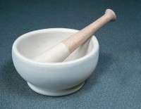Thick walled porcelain mortar; 107mm internal diameter and porcelain pestle.83-4170/01