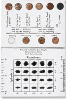 Pocket-sized folder enables the field geologist to quickly and accurately identify grain size and shape, grain sorting, roundness, and sphericity of a sample. Consists of sphericity/roundness measuring chart; printed examples of well-sorted and poorly-sorted grain samples in fine, medium, and coarse ranges; four actual grain samples illustrating angular, subangular, subrounded, and rounded shapes; six grain size samples: silt, very fine sand, fine sand, medium sand, coarse sand, and very coarse sand. Measurement limits for granules, pebbles, cobbles, and boulders indicated.