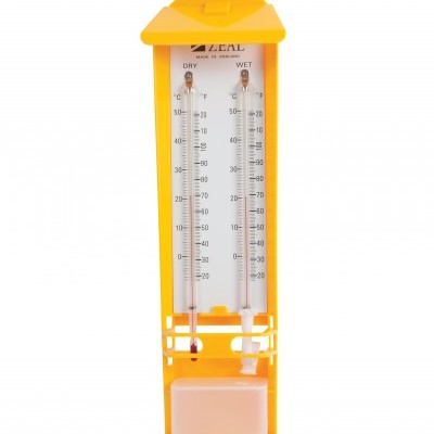 The wet and dry bulb hygrometer is designed for general use and consists of two undivided thermometers mounted on a printed plastic scale. Between the thermometers is a unique slide pointer which allows relative humidity to be easily read. The scale is housed in a plastic case which also holds a reservoir with anti-frost device